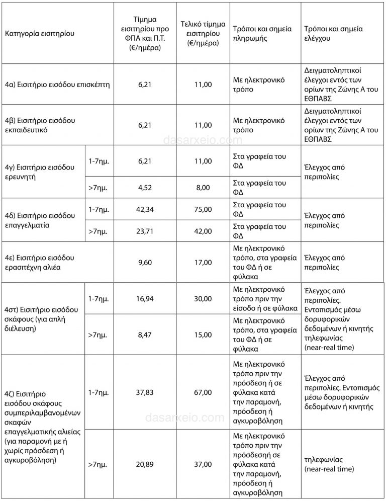 - Επισκέπτη: Αφορά (α) την είσοδο στο πάρκο μεμονωμένων ατόμων με σκάφος οργανωμένων εκδρομών, (β) την είσοδο με ιδιωτικό σκάφος, με ή χωρίς διανυκτέρευση και (γ) όσους επισκέπτες έρχονται για αλιευτικό τουρισμό.