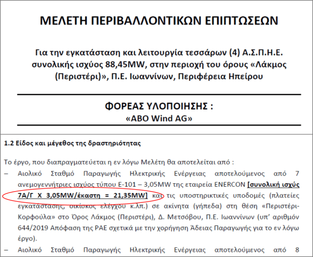 Εικόνα: Στην υπό αξιολόγηση ΜΠΕ 4 ΑΣΠΗΕ στον Λάκμο, ο ΑΣΠΗΕ «ΠΕΡΙΣΤΕΡΙ-ΚΟΡΦΟΥΛΑ» σχεδιάζεται να έχει 7 α/γ των 3 MW και συνολική ισχύ 21,35 MW