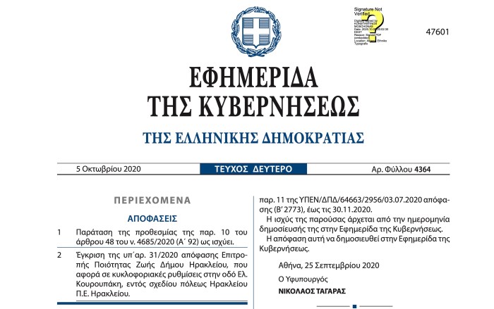 Υ.Α. ΥΠΕΝ/ΔΔΕΥ/92365/2652/25.09.2020 (ΦΕΚ Α΄ 4364) Παράταση της προθεσμίας της παρ. 10 του άρθρου 48 του ν. 4685/2020 (Α ́ 92) ως ισχύει.