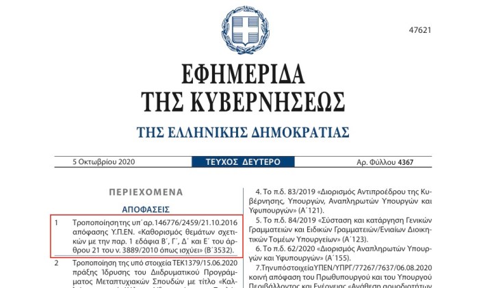 | ΥΠΕΝ/ΔΔΕΥ/92364/2651/25.09.2020 | Αριθ. 146776/2459/21.10.2016 |