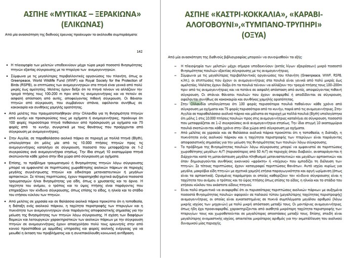 - Οι ΜΠΕ απαιτείται να κάνουν εκτίμηση των επιπτώσεων ενός έργου στο φυσικό περιβάλλον της ευρύτερης περιοχής επέμβασης. Οι μελετητές, ωστόσο, όταν δεν κάνουν επιτόπια καταγραφή και παρακολούθηση της ορνιθοπανίδας, αποφασίζουν αντί να αναφερθούν συγκεκριμένα στα πουλιά μιας περιοχής, να παραθέτουν γενικόλογες και εν πολλοίς άσχετες αναφορές για το «πόσο μικρή είναι η επίπτωση των αιολικών στην ορνιθοπανίδα»! Μοιάζει, επίσης, σαν κάποιος κεντρικός μηχανισμός να προμηθεύει με έτοιμο υλικό τα μελετητικά γραφεία, αν αναλογιστεί κανείς πως σε δύο ΜΠΕ για ΑΣΠΗΕ, που βρίσκονται ταυτόχρονα σε διαβούλευση (από διαφορετικούς μελετητές), βρίσκουμε ακριβώς το ίδιο κείμενο με αμελητέες αλλαγές στη διατύπωση!