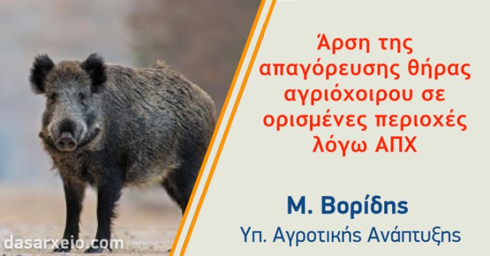 Για άρση της απαγόρευσης θήρας του αγριόχοιρου στις περιοχές που συνορεύουν με χώρες που έχουν κρούσματα αφρικάνικης πανώλης των χοίρων, έκανε λόγο ο Υπουργός Αγροτικής Ανάπτυξης, κ. Βορίδης, μιλώντας στον τηλεοπτικό σταθμό «ΣΚΑΙ».