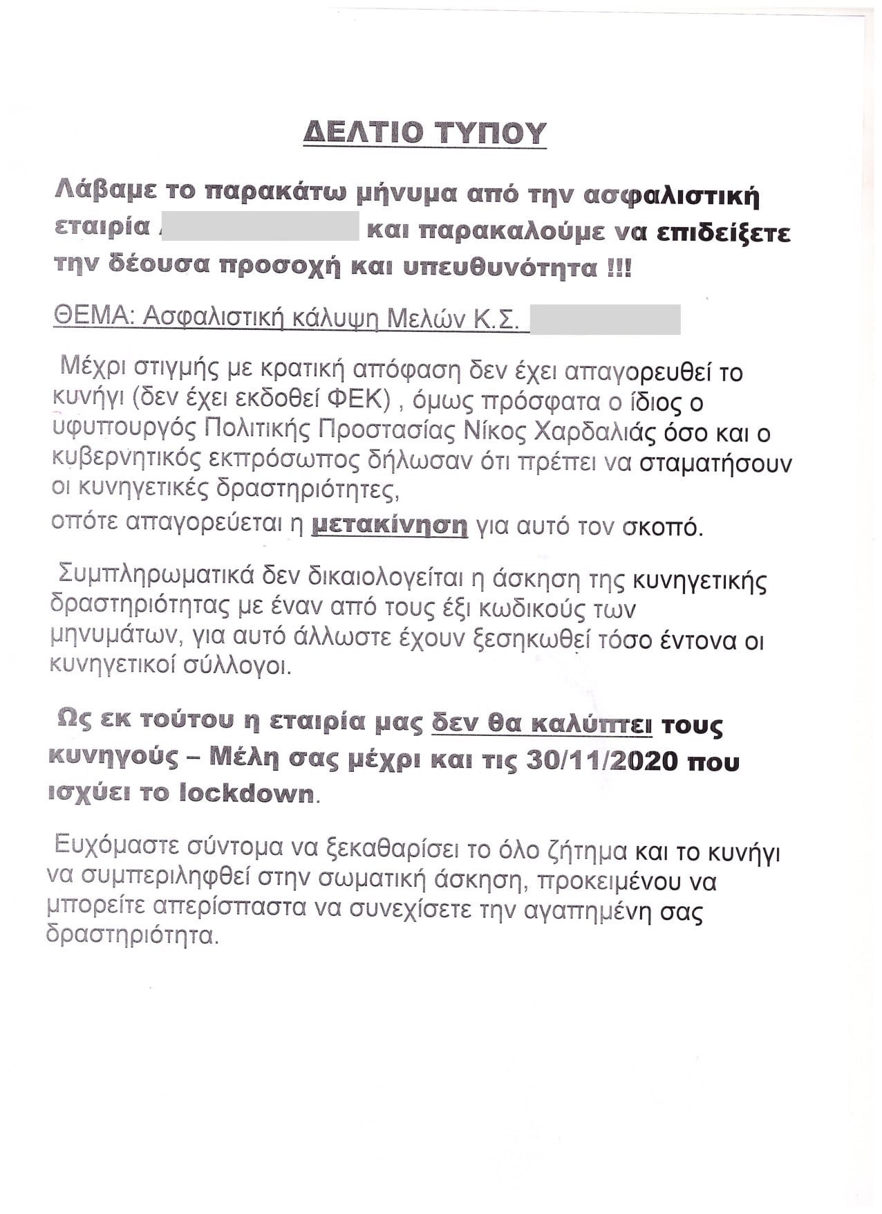 Μετά τις επανειλημμένες δηλώσεις και διευκρινίσεις του υφυπουργού Πολιτικής Προστασίας, Νίκου Χαρδαλιά, όσο και του κυβερνητικού εκπροσώπου, για περιορισμό της κυνηγετικής δραστηριότητας κατά τη διάρκεια των έκτακτων μέτρων (lockdown), ασφαλιστικές εταιρείες ενημερώνουν τους κυνηγετικούς συλλόγους, με τους οποίους έχουν συνάψει ασφαλιστική σύμβαση, ότι δεν θα καλύπτουν τους κυνηγούς – μέλη τους μέχρι και τις 30.11.2020 που ισχύει το lockdown.