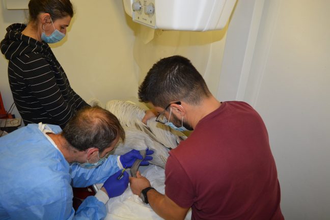 Μεταφέρθηκε άμεσα στο κτηνιατρείο του κου Καλτσά, στον Βόλο, όπου σε συνεννόηση με τον Σύλλογο Προστασίας Άγριας Ζωής ΑΝΙΜΑ, δόθηκαν οι πρώτες βοήθειες και χορηγήθηκε ενδοφλέβιος ορός.