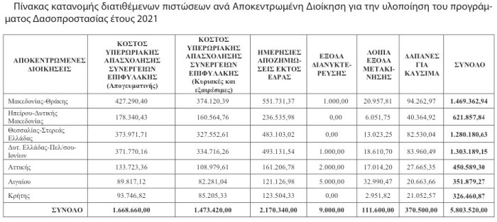 Η διάρκεια του προγράμματος ορίζεται για το χρονικό διάστημα, από τη δημοσίευση της υ.α. έως και τη 31.12.2021 και προβλέπεται σύνολο ωρών εργασίας μέχρι 544.920 ώρες με αντίστοιχο κόστος 3.142.080 €. Επιπλέον, προβλέπονται δαπάνες για ημερήσιες αποζημιώσεις, για εκτός έδρας κινήσεις μέχρι ποσού 2.170.340 €, δαπάνες για διανυκτερεύσεις μέχρι ποσού 9.000 € και χιλιομετρικές αποζημιώσεις κλπ έξοδα μετακίνησης μέχρι ποσού 111.600€, καθώς και δαπάνες για προμήθεια καυσίμων μέχρι ποσού 370.500 €. Κατά συνέπεια, το προβλεπόμενο κόστος του προγράμματος δασοπροστασίας για το έτος 2021, ανέρχεται στο συνολικό ποσό των 5.803.520 € (έναντι 5.796.520 του 2020).