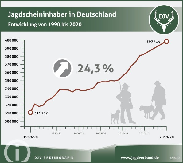 Ακριβώς το αντίθετο συμβαίνει στη Γερμανία. Σύμφωνα με τα στατιστικά στοιχεία που ανακοίνωσε η Ένωση Κυνηγών Γερμανίας (Deutscher Jagdverband), ο αριθμός των αδειών κυνηγιού σημείωσε νέο ρεκόρ το 2020. Αυξήθηκε κατά 8.900 άδειες σε σχέση με το προηγούμενο έτος και έφτασε στους 397.414 κυνηγούς. Τα τελευταία 30 χρόνια ο αριθμός των κυνηγών εμφανίζεται αυξημένος κατά 24,3% (311.257 άδειες θήρας κατά την κυνηγετική περίοδο 1989/90).