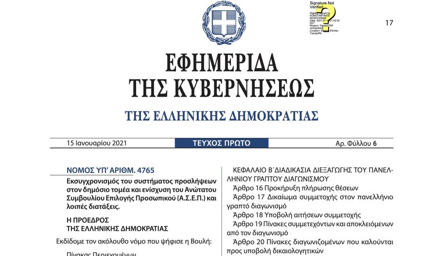 Δημοσιεύτηκε στην Εφημερίδα της Κυβερνήσεως ο Νόμος 4765/2021 «Εκσυγχρονισμός του συστήματος προσλήψεων στον δημόσιο τομέα και ενίσχυση του Ανώτατου Συμβουλίου Επιλογής Προσωπικού (Α.Σ.Ε.Π.) και λοιπές διατάξεις.» (ΦΕΚ Α΄ 6/2021).