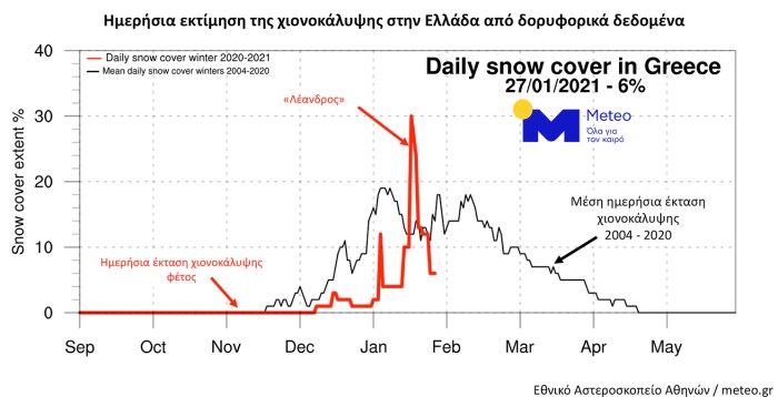 Στο Γράφημα παρουσιάζεται η ημερήσια διακύμανση της χιονοκάλυψης στην Ελλάδα από δορυφορικές μετρήσεις εκτιμάται ότι την περίοδο που διανύουμε το ποσοστό της χερσαίας έκτασης της χώρας που καλύπτεται από το χιόνι είναι περίπου 6%, αρκετά χαμηλότερο από τον μέσο όρο της περιόδου 2004-2020.