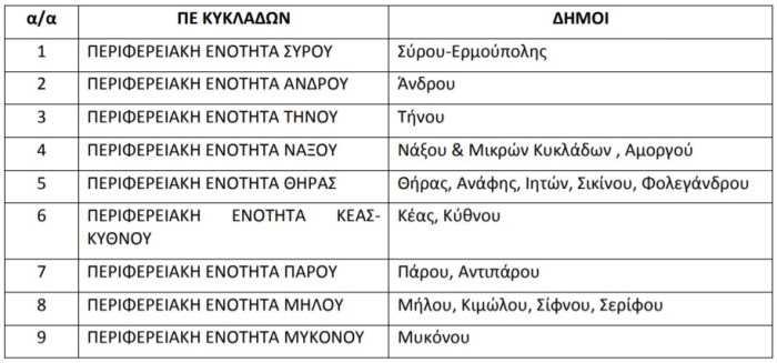 Από τη Διεύθυνση Δασών Κυκλάδων, ανακοινώνεται ότι με την αρ. πρ. 9095/23-02-2021 Απόφασή μας (ΑΔΑ: ΩΘΙΣΟΡ1Ι-ΑΞ2) αναρτήθηκαν στον ειδικό διαδικτυακό τόπο ανάρτησης δασικών χαρτών της ιστοσελίδας του ΝΠΔΔ “Ελληνικό Κτηματολόγιο” (https://www.ktimanet.gr/CitizenWebApp/Entrance_Page.aspx), οι δασικοί χάρτες των Περιφερειακών Ενοτήτων Σύρου, Άνδρου, Τήνου, Νάξου, Θήρας, Κέας- Κύθνου, Πάρου, Μήλου, Μυκόνου, συνολικής έκτασης 2.492.469,09 στρεμμάτων. Aναλυτικά οι Δήμοι αναφέρονται στον παρακάτω πίνακα: