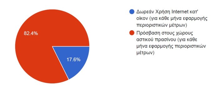 Σε μία ερώτηση «διλλήματος» μεταξύ δύο επιλογών οι οποίες υποθετικά θα προσφέρονταν δωρεάν στους πολίτες για κάθε μήνα διάρκειας της εφαρμογής περιοριστικών μέτρων, οι πολίτες κατά μεγάλη πλειοψηφία επέλεξαν την «πρόσβαση τους στους χώρους αστικού πρασίνου» έναντι της «δωρεάν χρήσης Internet κατ’ οίκον». Το εύρημα αυτό αναδεικνύει μεταξύ άλλων την «αξία χρήσης» των χώρων αστικού πρασίνου ως δημόσιο αγαθό καθώς και την μεγάλη αξία ευημερίας που απολαμβάνουν οι πολίτες από την ύπαρξη τους.