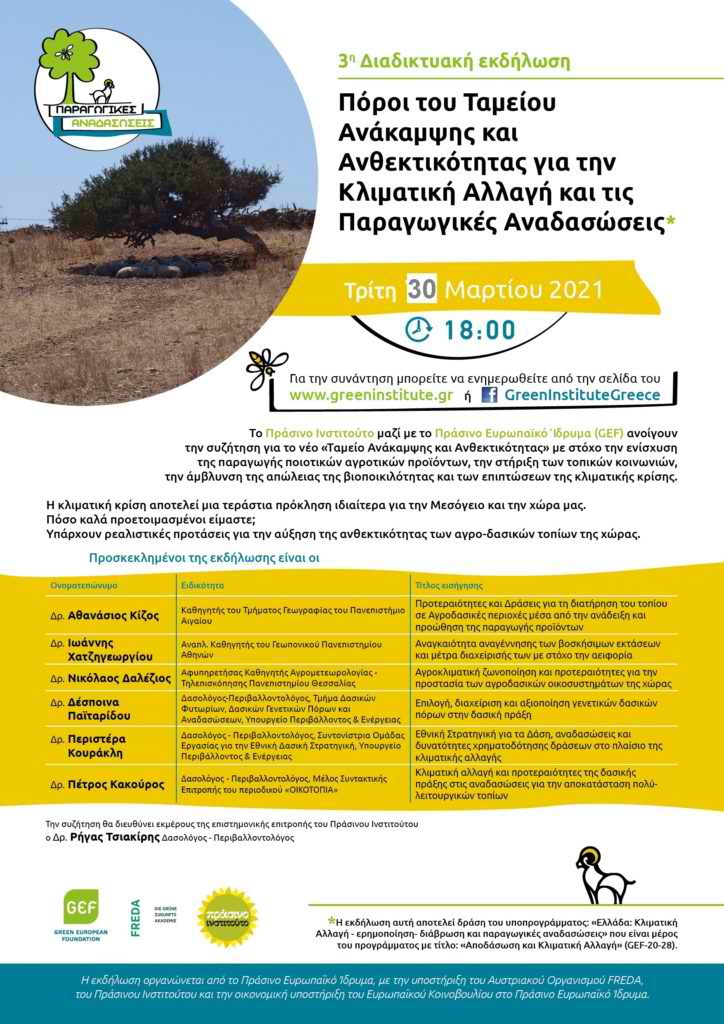 Το Πράσινο Ινστιτούτο, σε συνέχεια των δύο τελευταίων εξαιρετικά επιτυχημένων ημερίδων αναφορικά με τα αγροδασικά τοπία και τις παραγωγικές αναδασώσεις, διοργανώνει την 3η και τελευταία ημερίδα-συνάντηση εργασίας με θέμα «Κλιματική αλλαγή, παραγωγικές αναδασώσεις και οι πόροι του Ταμείου Ανάκαμψης και Ανθεκτικότητας», την Τρίτη 30 Μαρτίου 2021 και ώρα 18:00 μμ.