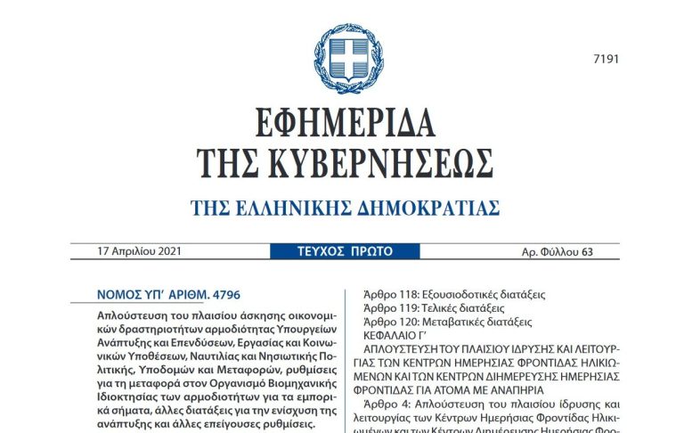 Ν. 4796/2021 (Α΄ 63) Απλούστευση του πλαισίου άσκησης οικονομικών δραστηριοτήτων αρμοδιότητας Υπουργείων Ανάπτυξης και Επενδύσεων, Εργασίας και Κοινωνικών Υποθέσεων, Ναυτιλίας και Νησιωτικής Πολιτικής, Υποδομών και Μεταφορών, ρυθμίσεις για τη μεταφορά στον Οργανισμό Βιομηχανικής Ιδιοκτησίας των αρμοδιοτήτων για τα εμπορικά σήματα, άλλες διατάξεις για την ενίσχυση της ανάπτυξης και άλλες επείγουσες ρυθμίσεις.
