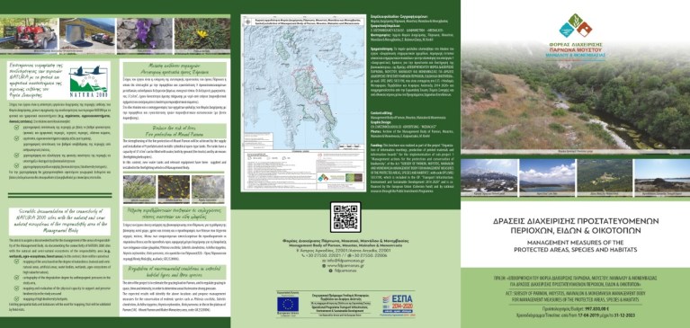 Η έκδοση των εντύπων υλοποιήθηκε στο πλαίσιο του έργου «Διοργάνωση ενημερωτικών ημερίδων, παραγωγή έντυπου υλικού και ενημερωτικών πινακίδων» για την υλοποίηση του υποέργου 1 «Διαχειριστικές δράσεις για την προστασία και διατήρηση της βιοποικιλότητας», της Πράξης «Επιχορήγηση του Φορέα Διαχείρισης Πάρνωνα, Μουστού, Μαινάλου & Μονεμβασίας για Δράσεις Διαχείρισης Προστατευόμενων Περιοχών, Ειδών & Οικοτόπων», με κωδ. ΟΠΣ (MIS) 5033190, που είναι ενταγμένη στο Ε.Π. «Υποδομές Μεταφορών, Περιβάλλον και Αειφόρος Ανάπτυξη 2014-2020» και συγχρηματοδοτείται από την Ευρωπαϊκή Ένωση (Ταμείο Συνοχής) και από εθνικούς πόρους μέσω του Προγράμματος Δημοσίων Επενδύσεων.