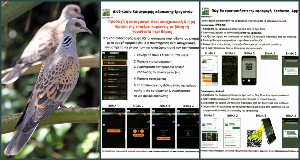 Την εφαρμογή (app) ΚΕΝΤΑΥΡΟΣ θα χρησιμοποιούν οι κυνηγοί μέλη των Κυνηγετικών Συλλόγων για την υποχρεωτική ψηφιακή καταγραφή της ημερήσιας κάρπωσης τρυγονιού κατά τη νέα κυνηγετική περίοδο.