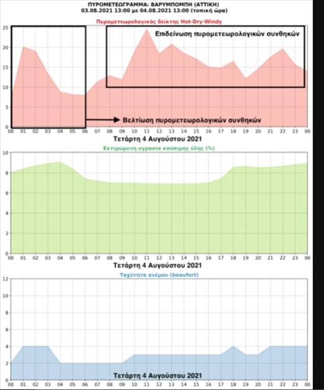 Σε ό,τι αφορά, τέλος, την εξέλιξη των πυρομετεωρολογικών συνθηκών στην ευρύτερη περιοχή της δασικής πυρκαγιάς, τα τελευταία διαθέσιμα προγνωστικά στοιχεία του ΕΑΑ – meteo.gr δείχνουν βελτιωμένες συνθήκες έως νωρίς το πρωί της Τετάρτης 4 Αυγούστου, με επιδείνωση από νωρίς το μεσημέρι και προς το απόγευμα της ίδιας ημέρας (04.08.2021), οπότε και περιμένουμε ενίσχυση των ανέμων.