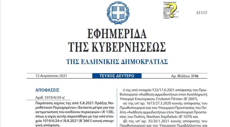 Παρατείνεται για μια εβδομάδα ακόμη, έως την Παρασκευή 20 Αυγούστου και ώρα 06.00, η ισχύς της Πράξης Νομοθετικού Περιεχομένου που ετέθη σε εφαρμογή στις 5 Αυγούστου και σύμφωνα με την οποία απαγορεύεται σε ολόκληρη τη χώρα η μετακίνηση, διέλευση ή παραμονή σε δάση, εθνικούς δρυμούς, περιοχές Natura και άλση.