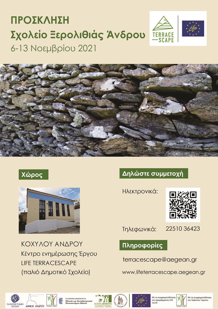 Η ομάδα του έργου LIFE TERRACESCAPE βρίσκεται στην ευχάριστη θέση να ανακοινώσει την διοργάνωση του Σχολείου Ξερολιθιάς που θα διεξαχθεί 6-13 Νοεμβρίου 2021 στο νησί της Άνδρου, που θα πραγματοποιηθεί για περιορισμένο αριθμό εκπαιδευομένων (15).