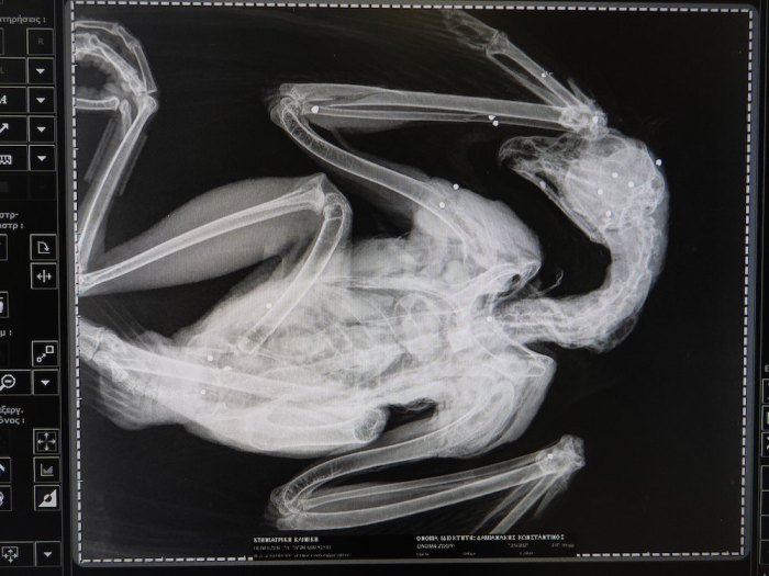 Όπως αποδείχθηκε από τη νεκροψία και τις ακτινολογικές εξετάσεις που ακολούθησαν, το αυστηρά προστατευόμενο αρπακτικό πουλί δολοφονήθηκε από βολή κυνηγετικού όπλου από σχετικά κοντινή απόσταση [Εικόνα 1].