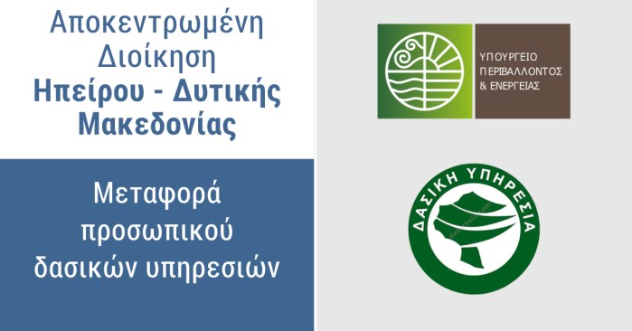 Με απόφαση του Συντονιστή Αποκεντρωμένης Διοίκησης Ηπείρου – Δυτικής Μακεδονίας διαπιστώνεται η μεταφορά από 13.8.2021 προσωπικού των Δασικών Υπηρεσιών, ανά κατηγορία/εκπαιδευτική βαθμίδα και κλάδο/ειδικότητα, που υπηρετούσε την 1η Αυγούστου 2021 στην Αποκεντρωμένη Διοίκηση Ηπείρου – Δυτικής Μακεδονίας, από το φορέα αυτό, στο Υπουργείο Περιβάλλοντος και Ενέργειας, όπως αποτυπώνεται στους πίνακες της απόφασης.