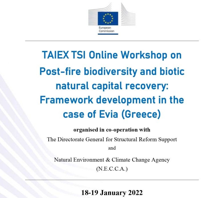 Πραγματοποιήθηκε στις 18-19 Ιανουαρίου το διαδικτυακό σεμινάριο «Επιπτώσεις των πυρκαγιών στη βιοποικιλότητα και ανάκτηση του βιοτικού φυσικού κεφαλαίου: Ανάπτυξη πλαισίου στην περίπτωση της Εύβοιας», το οποίο οργανώθηκε στα πλαίσια του Technical Assistance and Information Exchange Instrument -TAIEX TSI, υπό τη Γενική Διεύθυνση Υποστήριξης Διαρθρωτικών Μεταρρυθμίσεων (DG REFORM) της Ευρωπαϊκής Επιτροπής, έχοντας ως δικαιούχο τον Οργανισμό Φυσικού Περιβάλλοντος και Κλιματικής Αλλαγής (ΟΦΥΠΕΚΑ).