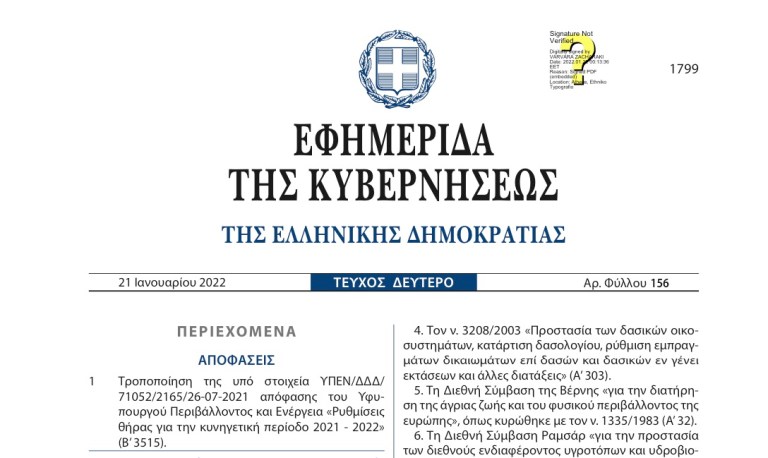 Κατά τα λοιπά εξακολουθεί να ισχύει η υπό στοιχεία ΥΠΕΝ/ΔΔΔ/71052/2165/26-07-2021 απόφαση του Υφυπουργού Περιβάλλοντος και Ενέργειας «Ρυθμίσεις θήρας για την κυνηγετική περίοδο 2021 – 2022» (Β’ 3515).