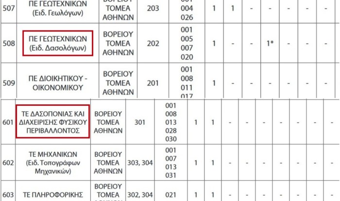 Κλάδων / Ειδικοτήτων: ΤΕ Δασοπονίας και Διαχείρισης Φυσικού Περιβάλλοντος, ΤΕ Μηχανικών (ειδ. Τοπογράφων Μηχανικών) και ΤΕ Πληροφορικής
