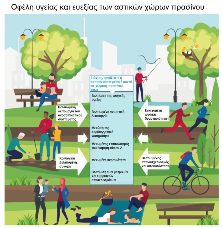 Προσβάσιμοι, υψηλής ποιότητας αστικοί πράσινοι και μπλε χώροι, όπως πάρκα, αστικά δάση, δεντρόφυτοι δρόμοι, αγροτεμάχια, όχθες ποταμών και ακτές, παρέχουν σημαντικά οφέλη για την υγεία των τοπικών κοινοτήτων. Ένα σημαντικό μέρος της επιβάρυνσης από ασθένειες στην Ευρώπη εξακολουθεί να αποδίδεται στην περιβαλλοντική ρύπανση που προκύπτει από την ανθρώπινη δραστηριότητα.