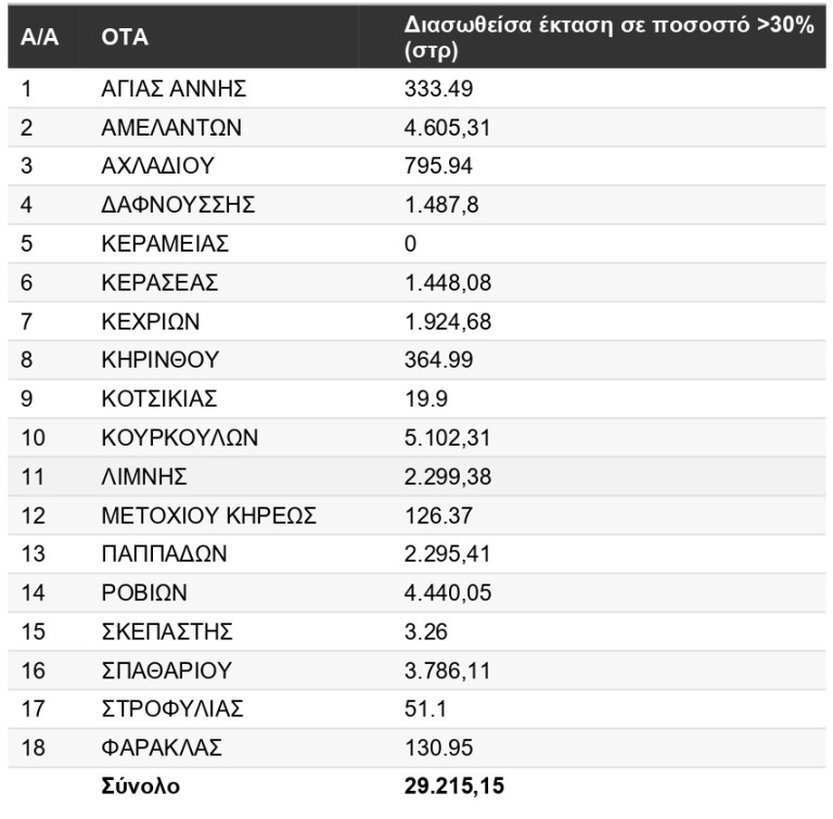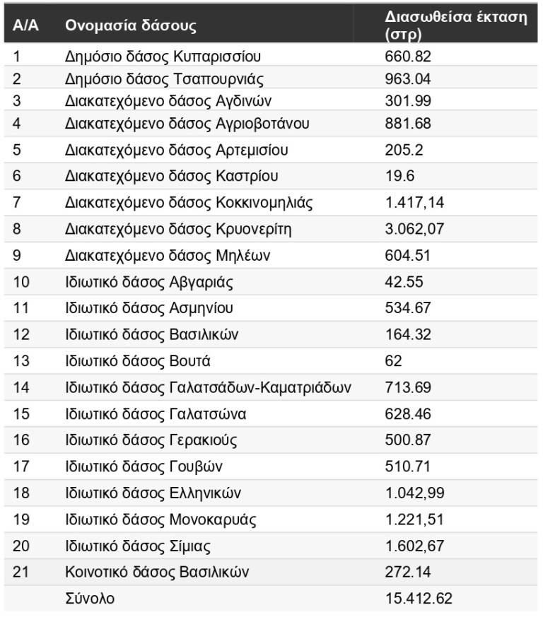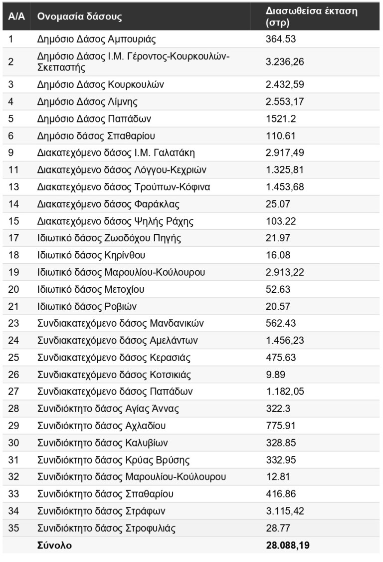 Το συνολικό εμβαδό των εκτάσεων που δεν κάηκαν σύμφωνα με τα παραπάνω κριτήρια ανέρχονται σε 43.940 στρ. και παρουσιάζονται στον παρακάτω πίνακα: