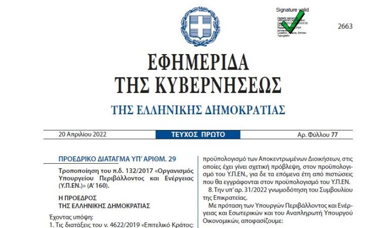 Π.Δ. 29/2022 (Α΄ 77) Τροποποίηση του π.δ. 132/2017 «Οργανισμός Υπουργείου Περιβάλλοντος και Ενέργειας (Υ.Π.ΕΝ.)» (Α΄ 160).