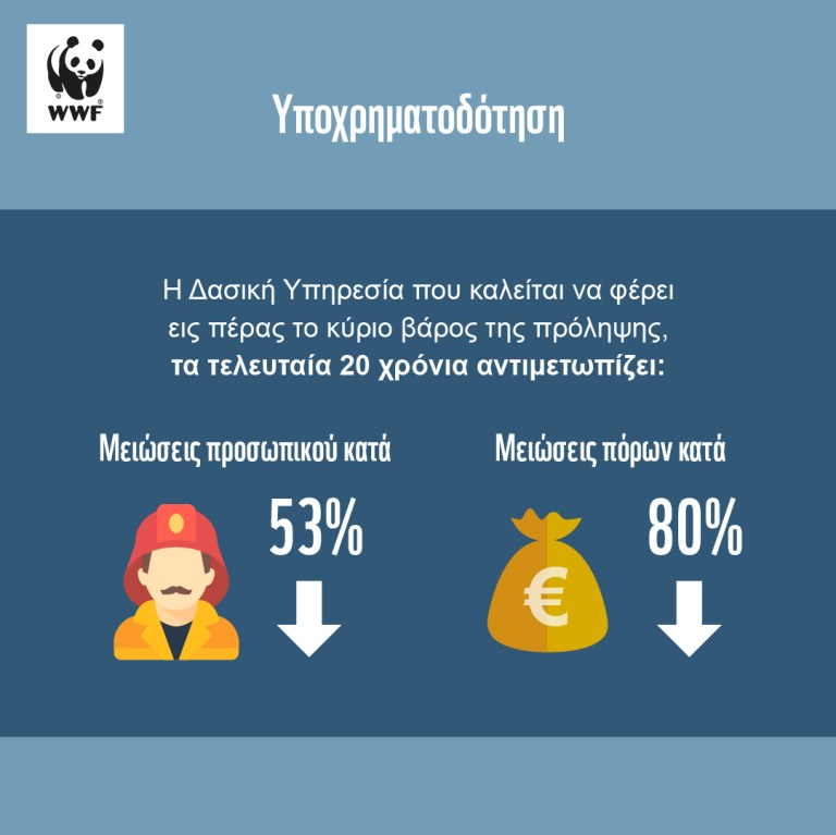 - Ανισοκατανομή μεταξύ καταστολής και πρόληψης και υποαπορρόφηση: Το σύστημα χρηματοδότησης της αντιμετώπισης των δασικών πυρκαγιών εστιάζει κυρίως σε δράσεις καταστολής έναντι δράσεων πρόληψης. Μάλιστα, για την περίοδο 2016-2020, το 83,95% των συνολικών κρατικών πόρων κατευθύνεται προς την καταστολή και μόλις το 16,05% προς την πρόληψη. Την ίδια στιγμή, η τελευταία έκθεση του Περιβαλλοντικού Προγράμματος του ΟΗΕ κάνει έκκληση προς τις κυβερνήσεις να επανεξετάσουν τις δαπάνες για την κατάσβεση των πυρκαγιών προτείνοντας τη διάθεση του 45% του προϋπολογισμού τους για την πρόληψη και την ετοιμότητα, το 35% για την καταστολή των πυρκαγιών και το 20% για την αποκατάσταση.