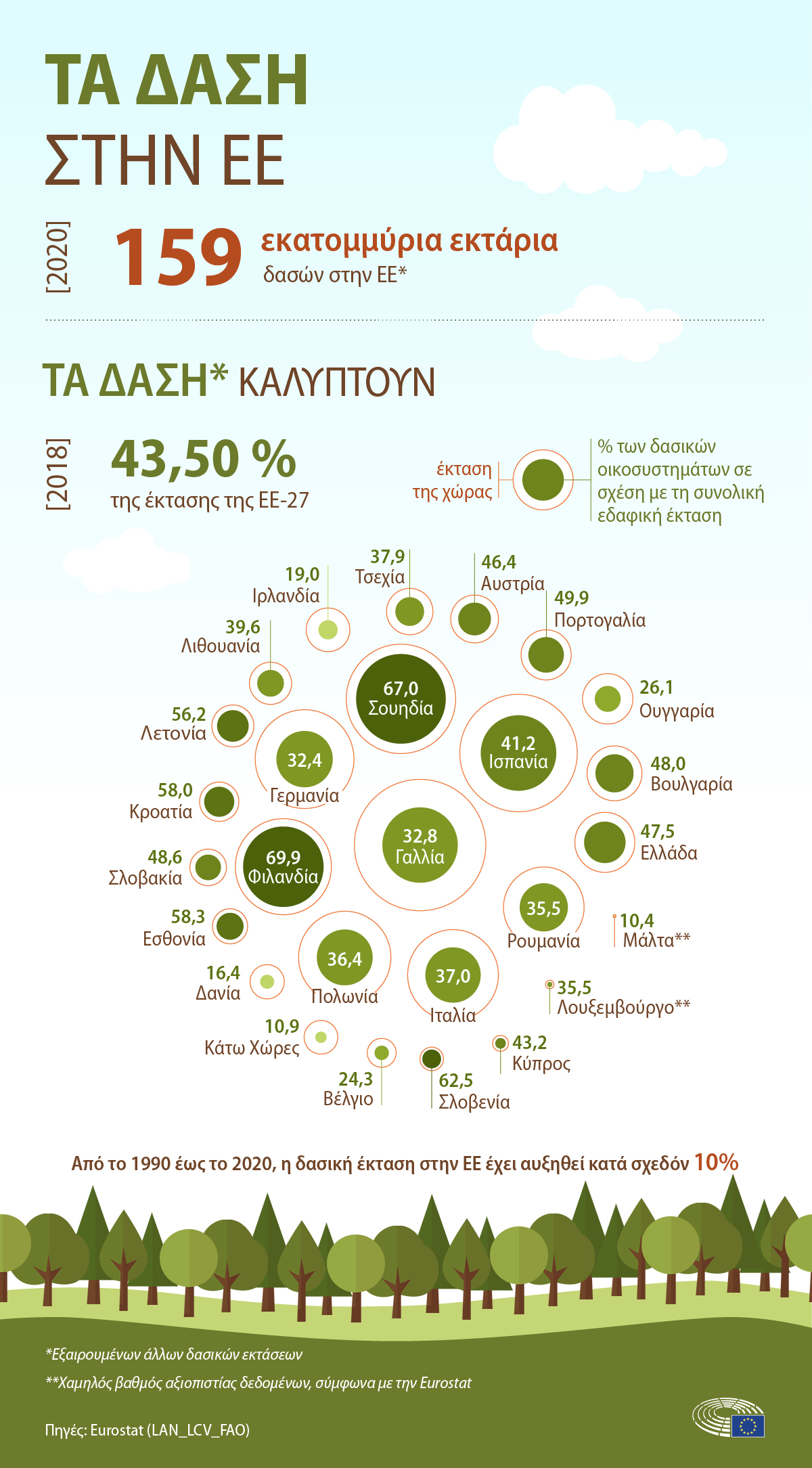 Στην ΕΕ υπάρχουν 159 εκατομμύρια εκτάρια δασών. Συνολικά, καλύπτουν το 43,5% της έκτασης της ΕΕ. Η δασική έκταση ποικίλλει σημαντικά από το ένα κράτος μέλος στο άλλο. Καλύπτουν, για παράδειγμα, το 10% της εδαφικής έκτασης της Μάλτας ενώ το 70% της εδαφικής έκτασης της Φιλανδίας.