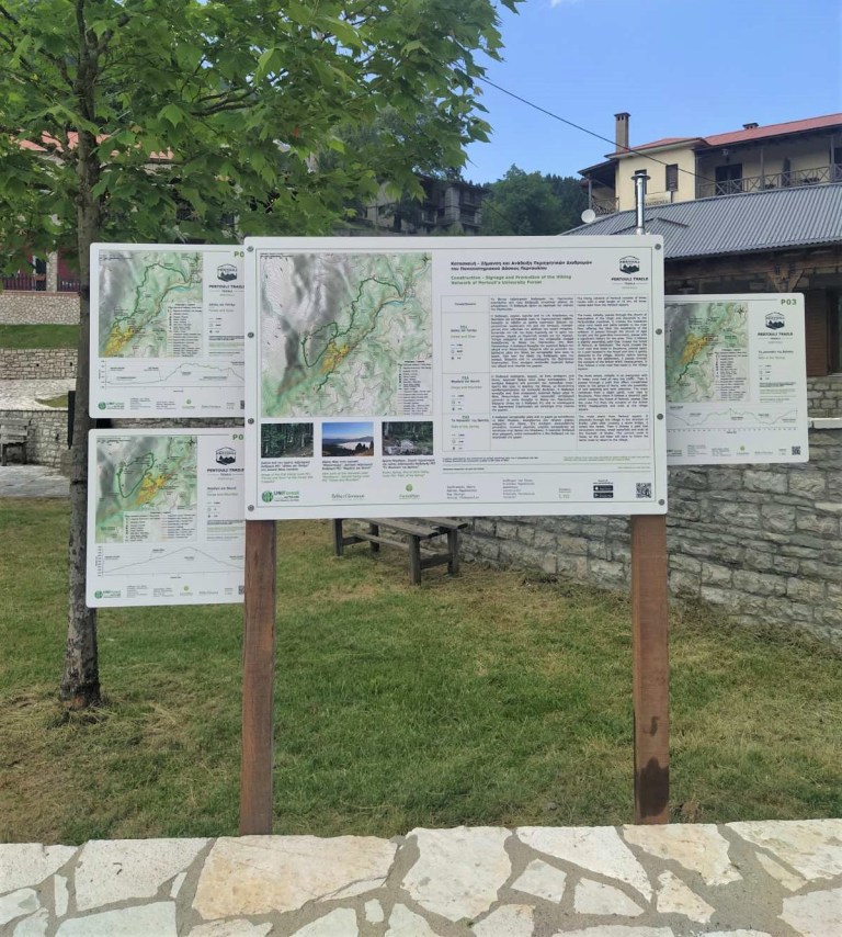 Το δίκτυο Μονοπατιών περιλαμβάνει τρεις κύριες περιηγητικές διαδρομές συνολικού μήκους 16 χλμ. Οι διαδρομές αυτές διέρχονται από μοναδικής φυσικής ομορφιάς δάση, ρέματα και άλλα σημεία ενδιαφέροντος της περιοχής, όπως τα Περτουλιώτικα Λιβάδια, ο Ι.Ν. Αγίας Κυριακής, το Ηρώο των Ανταρτών, τα Υπολείμματα του Βρετανικού Στρατηγείου του 2ου Παγκοσμίου Πολέμου, το Φαράγγι της Μάνας και η Βρύση Μπράικου.