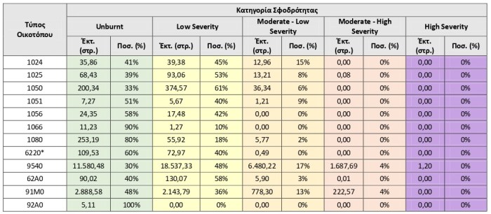- Πολύ μεγάλο είναι το ποσοστό που εμφανίζεται ως χαμηλής σφοδρότητας πυρκαγιά (Low Severity), και θα πρέπει να γίνει λεπτομερής έρευνα στις εκτάσεις αυτές ώστε να αναζητηθούν ζωντανά άτομα που θα μπορέσουν να λειτουργήσουν ως σπορείς για την αποκατάσταση των οικοσυστημάτων.