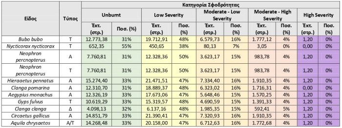 Πίνακας 3: Θιγόμενοι τύποι οικοτόπου ανά κατηγορία σφοδρότητας