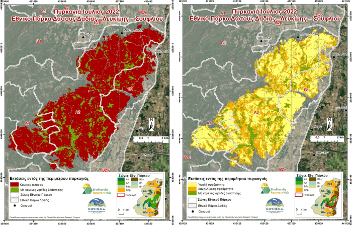 Η επεξεργασία δορυφορικών εικόνων πολύ υψηλής χωρικής ανάλυσης (3 μέτρα) από το Post Fire Biodiversity Recovery Hub του Ο.ΦΥ.ΠΕ.Κ.Α. μετά την κατάσβεση της πυρκαγιάς στο Εθνικό Πάρκο Δαδιάς
