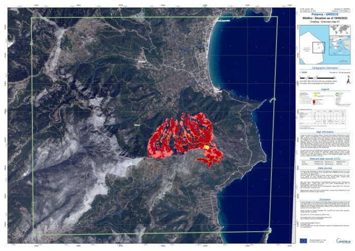 Διευκρινίζεται ότι η περίμετρος της πληγείσας έκτασης, όπως έχει αποτυπωθεί μετά από ανάλυση δορυφορικής εικόνας SPOT7 με ακρίβεια 1,5 μέτρου στο έδαφος, μέσω της υπηρεσίας Copernicus EMS – On Demand Mapping – Rapid Mapping, απεικονίζει την κατάσταση κατά την ημέρα και ώρα λήψης (19/8/2022, ώρα 11:44 τοπική) και σε καμία περίπτωση δεν είναι δεσμευτική, παρέχεται προς υποβοήθηση και δεν υποκαθιστά την οριοθέτηση πληγείσας περιοχής από τους αρμόδιους φορείς και υπηρεσίες με βάση το ισχύον θεσμικό πλαίσιο.