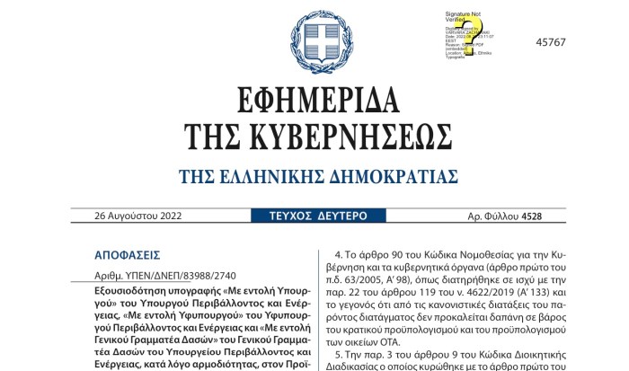 Δημοσιεύτηκε στην Εφημερίδα της Κυβερνήσεως η απόφαση με την οποία παρέχεται η εξουσιοδότηση υπογραφής «Με εντολή Υπουργού ΠΕΝ» του Υπουργού Περιβάλλοντος και Ενέργειας, «Με εντολή Υφυπουργού ΠΕΝ» του Υφυπουργού Περιβάλλοντος και Ενέργειας και «Με εντολή Γενικού Γραμματέα Δασών» του Γενικού Γραμματέα Δασών του Υπουργείου Περιβάλλοντος και Ενέργειας, κατά λόγο αρμοδιότητας, στον Προϊστάμενο της Γενικής Διεύθυνσης Δασών και Δασικού Περιβάλλοντος της Γενικής Γραμματείας Δασών του Υ.Π.ΕΝ., στους Προϊστάμενους των Επιθεωρήσεων Εφαρμογής Δασικής Πολιτικής και στους Προϊστάμενους των Διευθύνσεων, Δασαρχείων και Τμημάτων που υπάγονται σε αυτές, καθώς και στους αναπληρωτές αυτών, ως εξής: