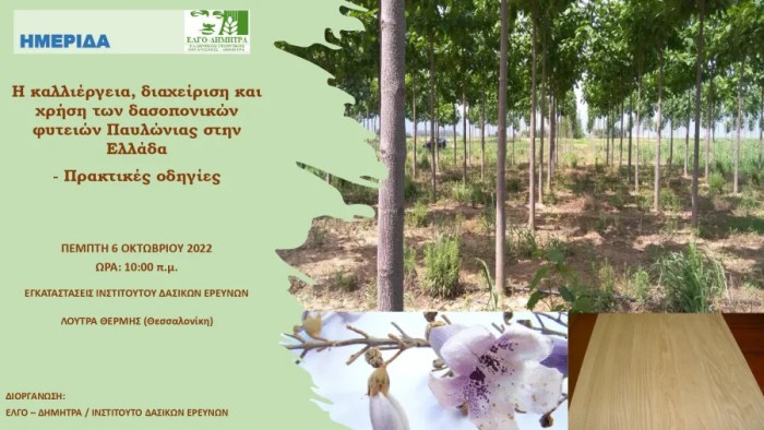 Ημερίδα με θέμα «Η καλλιέργεια, διαχείριση και χρήση των δασοπονικών φυτειών Παυλώνιας στην Ελλάδα – Πρακτικές οδηγίες» διοργανώνει το Ινστιτούτο Δασικών Ερευνών του ΕΛΓΟ-ΔΗΜΗΤΡΑ, στο πλαίσιο υλοποίησης ερευνητικών προγραμμάτων (έρευνα εφαρμογής).