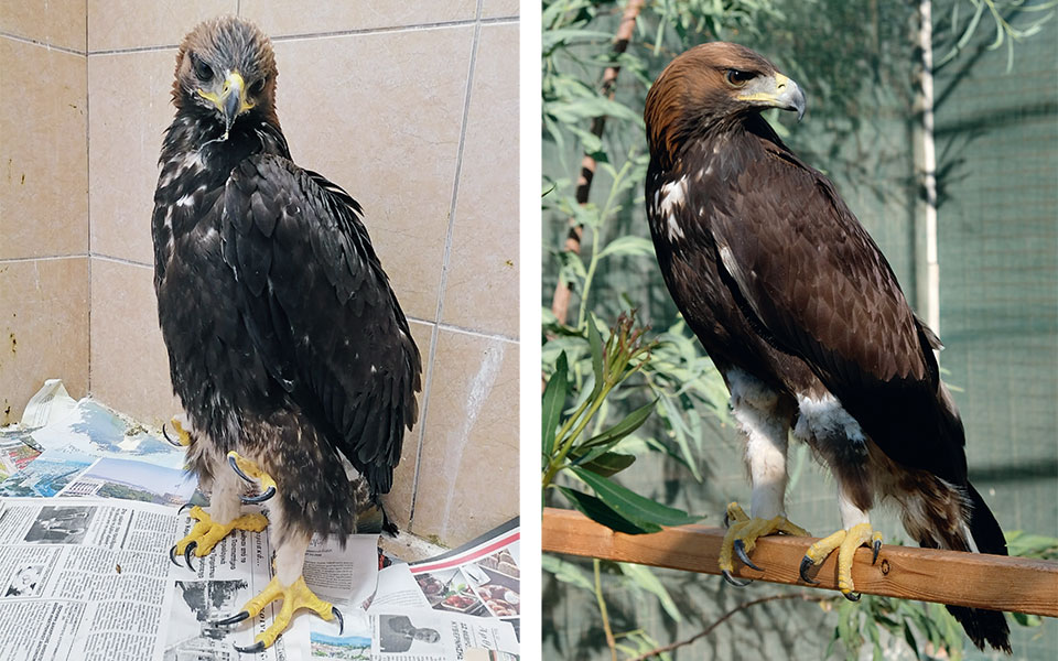 Αριστερά, ο χρυσαετός όπως εντοπίσθηκε το καλοκαίρι σε φωλιά στον Λαγκαδά Θεσσαλονίκης, με «εφεδρικά» πόδια και στα δύο άκρα, και δεξιά, μετά τη χειρουργική αφαίρεση των επιπλέον άκρων, στην Κτηνιατρική Σχολή του ΑΠΘ.