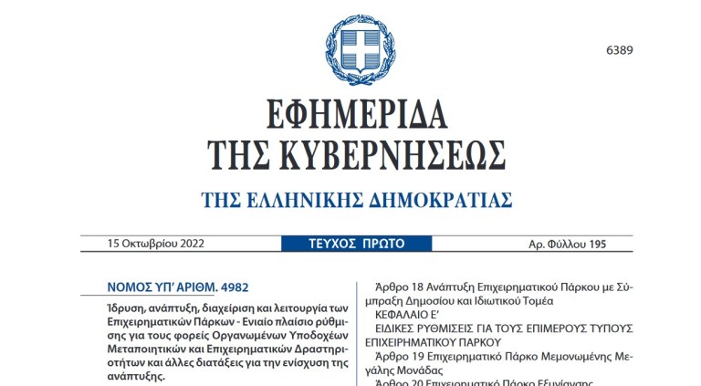 Νόμος 4982/2022 (Α΄ 195) Ίδρυση, ανάπτυξη, διαχείριση και λειτουργία των Επιχειρηματικών Πάρκων – Ενιαίο πλαίσιο ρύθμισης για τους φορείς Οργανωμένων Υποδοχέων Μεταποιητικών και Επιχειρηματικών Δραστηριοτήτων και άλλες διατάξεις για την ενίσχυση της ανάπτυξης.