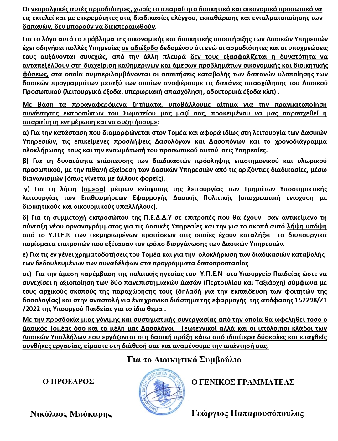 «Με την προσδοκία μιας γόνιμης και συστηματικής συνεργασίας από την οποία θα ωφεληθεί τόσο ο Δασικός Τομέας όσο και τα μέλη μας Δασολόγοι – Γεωτεχνικοί αλλά και οι υπόλοιποι κλάδοι των Δασικών Υπαλλήλων που εργάζονται στη δασική πράξη κάτω από ιδιαίτερα δύσκολες και επαχθείς συνθήκες εργασίας, είμαστε στη διάθεσή σας και αναμένουμε την απάντησή σας», καταλήγει η επιστολή της ΠΕΔΔΥ.