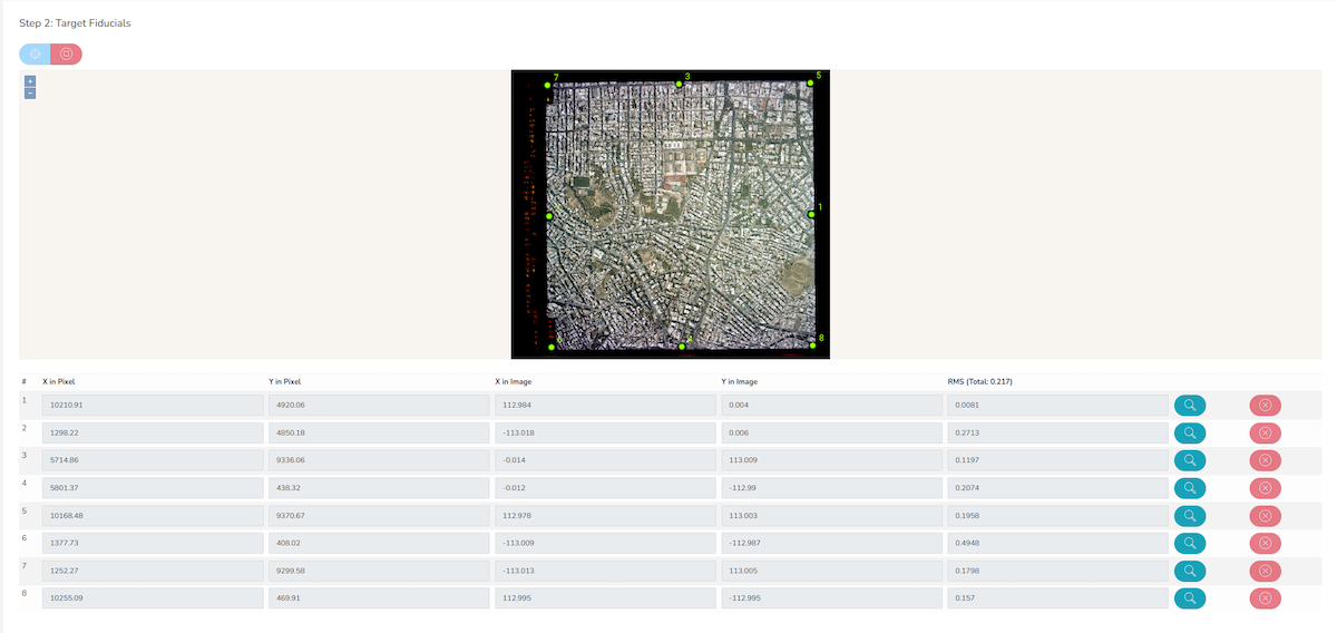 3. Σκόπευση Επίγειων Σημείων Ελέγχου (Εικόνα 5). Ο χρήστης σκοπεύει στο αριστερό παράθυρο (Εικόνα αναφοράς) και μετά στο δεξί παράθυρο (χαρτογραφικό Υπόβαθρο) το ίδιο σημείο. Μπορεί να τροποποιήσει τις συντεταγμένες χειροκίνητα μέσα από τον πίνακα των συντεταγμένων, ενώ μπορεί να παρέχει και το υψόμετρο του σημείου. Στην περίπτωση που το υψόμετρο δεν δοθεί λαμβάνεται αυτόματα από το σύστημα από το ψηφιακό μοντέλο αναγλύφου που χρησιμοποιείται (είτε το ενσωματωμένο του OrthoPhoto.io είτε αυτό που παρέχει ο χρήστης). Το αποτέλεσμα για λόγους ταχύτητας της διαδικασίας παρέχεται σε σμίκρυνση.