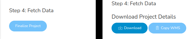 4. Εξαγωγή Τελικού Αποτελέσματος (Εικόνα 6). Όταν ο χρήστης κρίνει ότι έχει φτάσει ικανοποιητικό επίπεδο ακρίβειας, επιλέγοντας το Finalize Project δίνει εντολή στο σύστημα να δημιουργήσει την τελική ορθοφωτογραφία (Εικόνα 6). Όταν τελειώσει η διαδικασία της ορθοαναγωγής, τότε του δίνει τη δυνατότητα να κατεβάσει το τελικό αποτέλεσμα ή να πάρει το σύνδεσμο (URL) του WMS για να το χρησιμοποιήσει στο GIS περιβάλλον της επιλογής του.