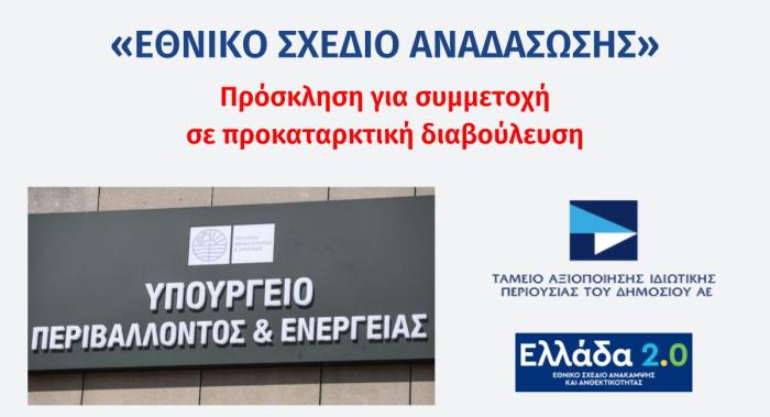 Το ΤΑΙΠΕΔ και, ενεργώντας κατ’ εντολή, στο όνομα και για λογαριασμό του Υπουργείου Περιβάλλοντος και Ενέργειας, προσκαλεί τους ενδιαφερόμενους οικονομικούς φορείς σε προκαταρκτική διαβούλευση κατά τα άρθρα 46 και 47 του Ν. 4412/2016 (Α’ 147), μη δεσμευτική για το ΤΑΙΠΕΔ (και την Αναθέτουσα Αρχή), με σκοπό την προετοιμασία διαγωνιστικής διαδικασίας ανάθεσης συμβάσεων, άνω των ορίων, με αξιολόγηση μελέτης, σύμφωνα με τις διατάξεις του Ν. 4412/2016, για το Έργο «Εθνικό Σχεδίου Αναδάσωσης».