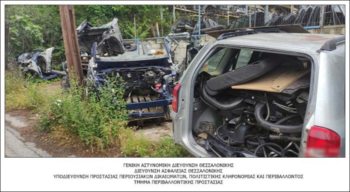 Από την επιτόπια έρευνα των Αρχών διαπιστώθηκε, επιπλέον, ότι η επιχείρηση, που βρίσκεται στην Πυλαία Θεσσαλονίκης, δεν διέθετε την προβλεπόμενη άδεια για τη διάλυση αυτοκινήτων τέλους κύκλου ζωής χειρωνακτικά, όπως αναφέρεται σε ανακοίνωση της αστυνομίας.