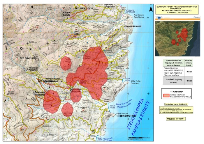 Η καμένη έκταση στην πυρκαγιά του Πλατανιστού της Καρυστίας, μέχρι σήμερα το πρωί (Δευτέρα 24/7),