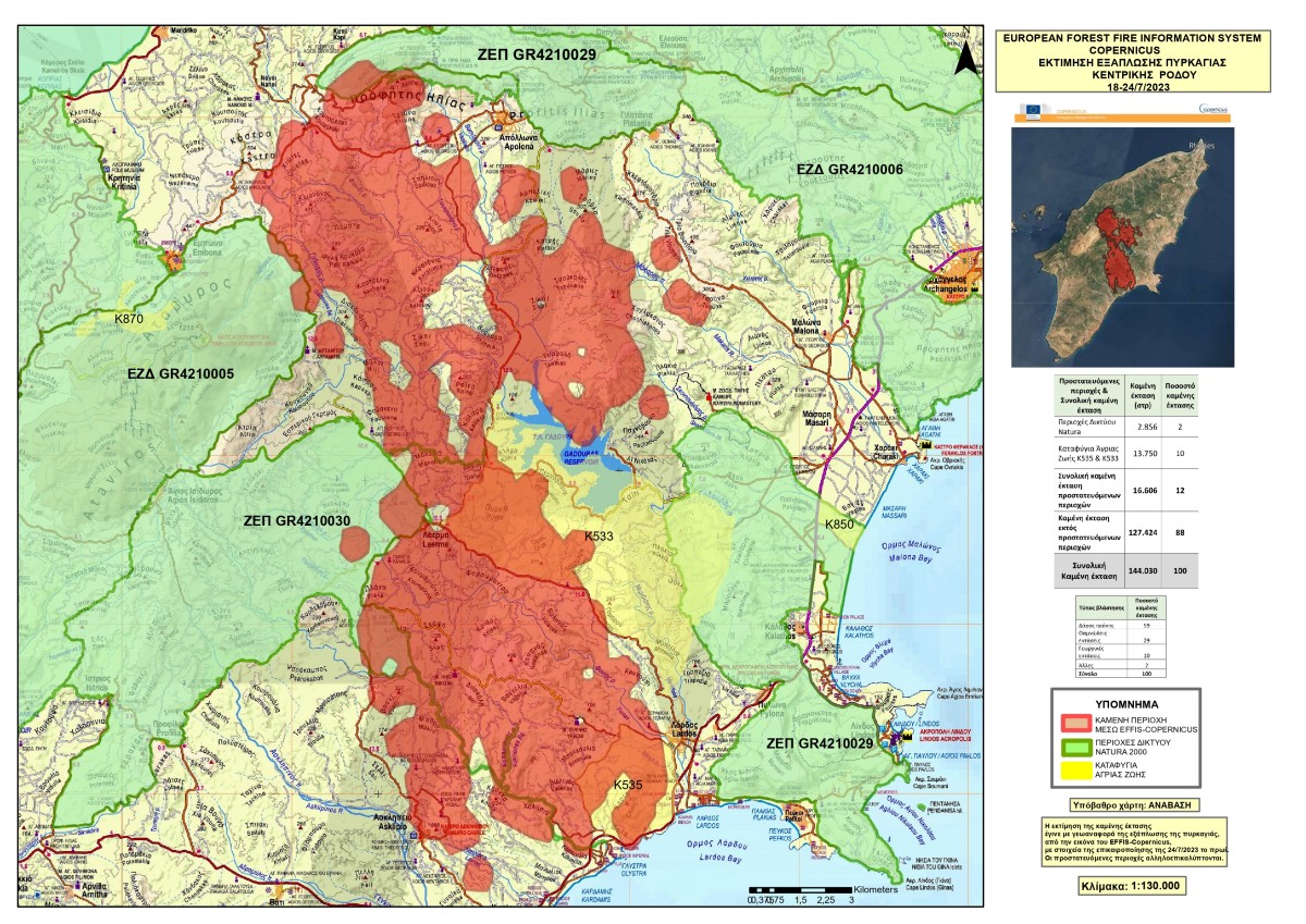 Η καμένη έκταση στην πυρκαγιά της Ρόδου, μέχρι σήμερα το πρωί (Δευτέρα 24/7), ήταν 144.030 στρ. τα οποία αντιστοιχούν στο 10% της έκτασης του νησιού της Ρόδου.