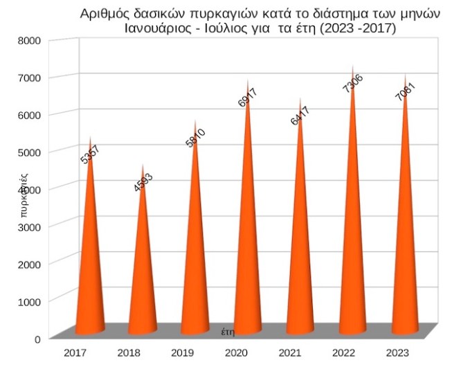 Ο προαναφερόμενος αριθμός των 7.081 αγροτοδασικών πυρκαγιών είναι μειωμένος σε ποσοστό 3,1%% σε σχέση με το αντίστοιχο χρονικό διάστημα του έτους 2022, ενώ είναι αυξημένος σε ποσοστό 9,4%, από το 2021, 2,3%, από το 2020, 17,9%, από το 2019, 35,1%, από το 2018 και 24,3%, από το 2017.