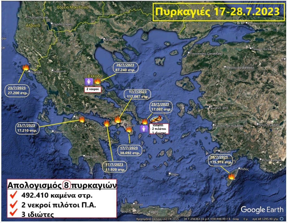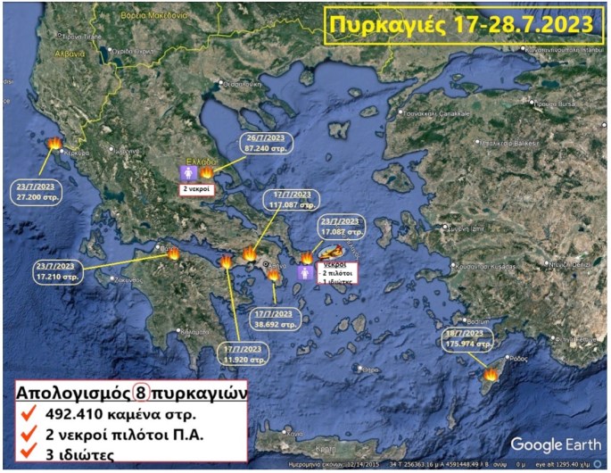 Επίσης έχασαν τη ζωή τους: α) 2 πιλότοι – αξιωματικοί της Π.Α. από την πτώση του Α/Φ CL – 215 (1055) στο Πλατανιστό του Δήμου Καρύστου που μετείχε την 25.7.2023 σε επιχείρηση αεροπυρόσβεσης και β) 3 ιδιώτες (1 άνδρας (κτηνοτρόφος) στην ίδια ως άνω πυρκαγιά της Καρυστίας και 2 άτομα στην πυρκαγιά του Βελεστίνου Μαγνησίας και πιο συγκεκριμένα 1 άνδρας (κτηνοτρόφος) στον Άγιο Γεώργιο Φερών και 1 γυναίκα σε τροχόσπιτο στο Χοροστάσι).