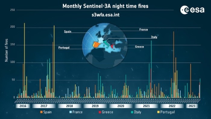 Τα στοιχεία του Άτλαντα δείχνουν κατά την τελευταία επταετία σημαντικό αριθμό πυρκαγιών στην Πορτογαλία, την Ιταλία, την Ελλάδα, τη Γαλλία και την Ισπανία, με τον υψηλότερο αριθμό πυρκαγιών να σημειώνεται στην Πορτογαλία τον Αύγουστο του 2016 και τον Οκτώβριο του 2017. Σύμφωνα με το Ευρωπαϊκό Πληροφοριακό Σύστημα για τις Δασικές Πυρκαγιές (EFFIS) φέτος (μέχρι τις 29 Ιουλίου 2023) είχαν καεί ήδη περισσότερα από 234.516 εκτάρια γης σε όλη την Ευρωπαϊκή Ένωση.